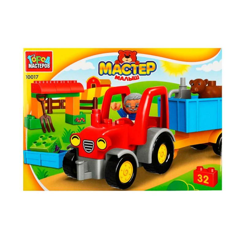 Конструктор большие кубики Город мастеров трактор с тележкой