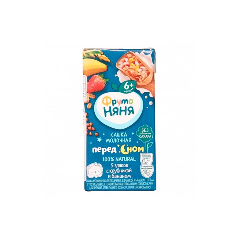Кашка молочная из пяти злаков с клубникой и бананом, готовая к употреблению, стерилизованная, обогащенная пребиотиками для питания детей дошкольного и школьного возраста. Гомогенизированная.