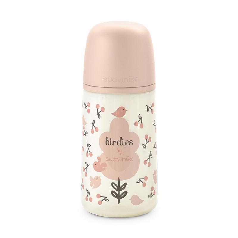 Нежно-розовая бутылочка Suavinex Birdies словно маленький лучик света, дарящий тепло и уют. Лёгкая и удобная, она делает каждый момент кормления спокойным и гармоничным, создавая ощущение заботы и близости.