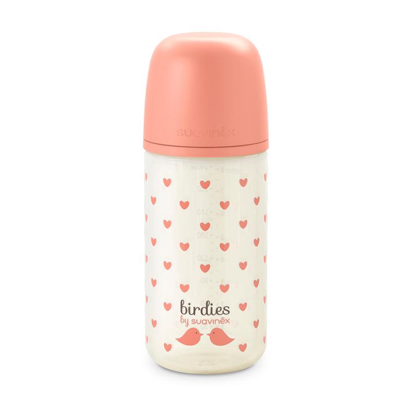Бутылочка стеклянная Suavinex Birdies розовая 240мл